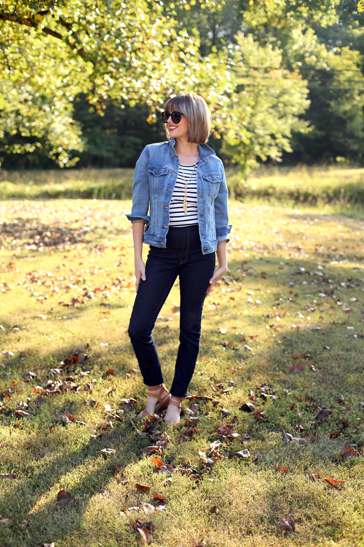 I’m still rolling with my 70s Art Teacher vibe, but the cut also makes me feel a little indie Parisian, especially with red lipstick. With that in mind, stripes and high waisted jeans were my first outfit choice! The top is old and the jeans haven’t fit since before I had Felix!!