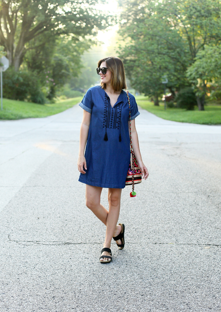 It’s a relatively dark piece for summer, so I’ve brightened it up with a colorful bag I bought a few vacations ago and a summery bright lipstick. (I wore it earlier this spring with another chambray dress here!) I haven’t been able to wear any eye makeup for over a week (pink eye, ugh) but I think I might be just about done with it. Hope you’re having a nice week where ever you are!